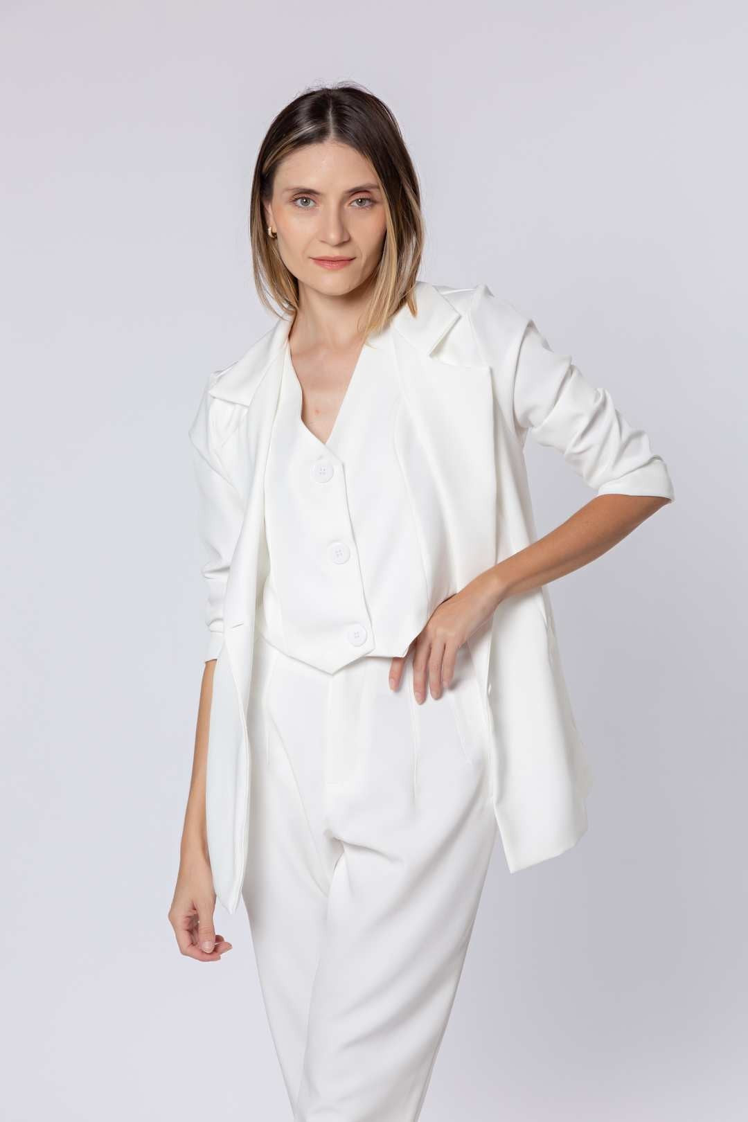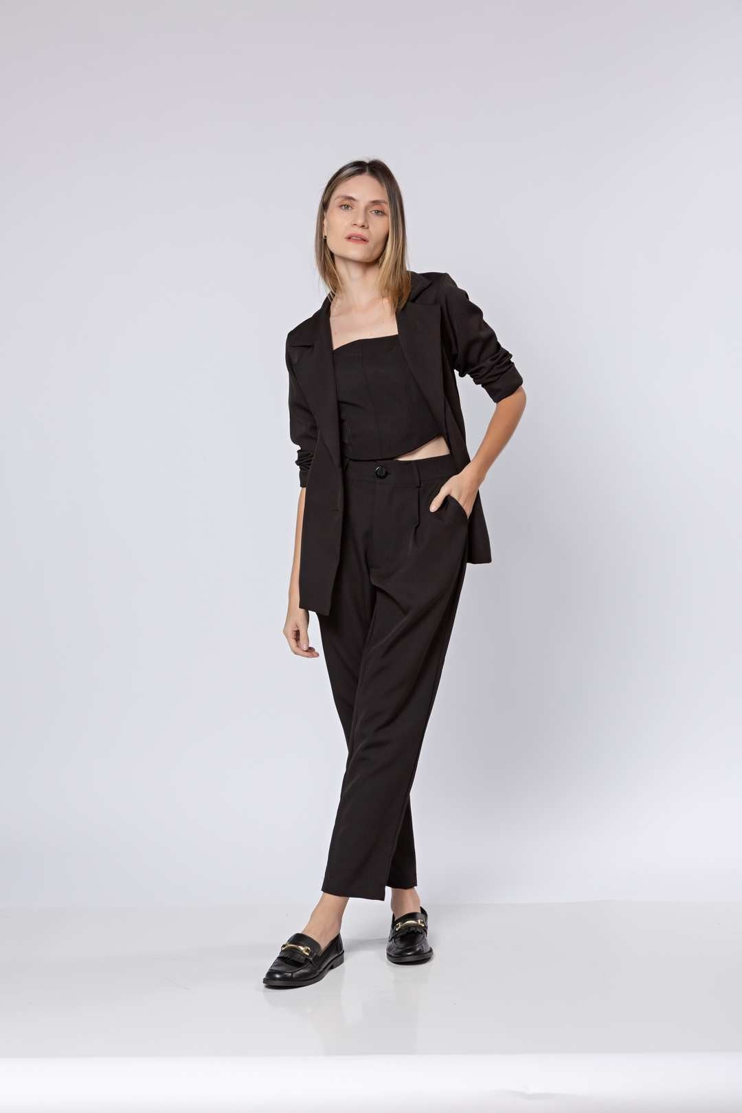 O Blazer Alfaiataria é uma escolha sofisticada para todas as estações. Com botões forrados e dupla na parte da frente, é uma peça estruturada que garante um visual elegante. Fabricado com tecido de alta qualidade (94% poliéster, 6% elastano), gramatura 200, oferecendo conforto e estilo duradouros.